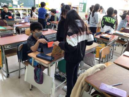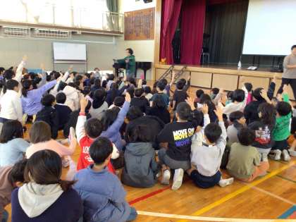 2年生が学年集会を行っていて、3学期は「3年生の0学期」、2学期の残り30日間でさらに下学年のお手本になろうと話し合っていました。人の気持ちを考えること、約束を守ること、タブレットは学習に使うために世田谷区から貸してもらっているということを全員で再確認できました。