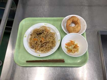 <本日の献立> 塩焼きそば 野菜の中華かけ ごまドーナッツ