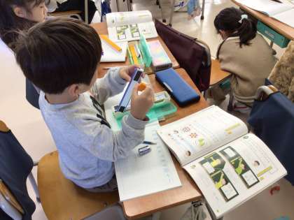1年生の国語の学習では、ウサギのムギやクラスで飼っているカメについて、観察し報告文を書いています。「おうちの人に伝えたい」ことをふせんに書き出し、グルーピングし、ふせんの場所を入れ替え、伝えたい内容の優先順位をつけていました。自分の考えを相手に分かりやすく伝えるプレゼンテーション力を1年生から身に付けさせていきます。