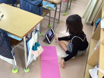 駒繋小の2年生は、iMovieというアプリを使い、自分で絵本を朗読している様子を動画編集し、いつでも読み聞かせを行えるようにしていました。中丸小でも4年生は動画編集を授業の中で行っていましたが、2年生でも使いこなせることが分かったので、中丸小の2年生にもより効果的な場面で利用させていきます。
