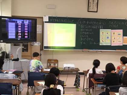 1年生と5年生の教室では、デジタルシティズンシップの学習を行っていました。それぞれの学年の発達に応じて、資料提示が工夫されており、友だちと意見を交流し合う中で、自分の考えを深めていました。
