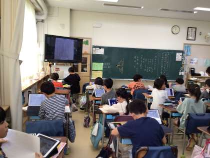 今日の午後は響きの学び舎、駒留中・旭小・駒繋小・中丸小の4校の先生が、駒繋小の5時間目の授業を参観した後、研修会を行いました。今年度、響きの学び舎では、「協働的な学び」と「ICT端末の効果的な利活用」を重点項目にし各校で授業改善を行っています。