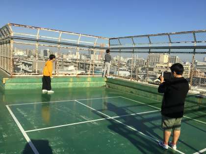 国語の「柿山伏」を朗々と発声するには、教室は狭いので、屋上で音読練習に取り組みました。狂言独特の言い回し、所作も入れながら取り組んでいました。