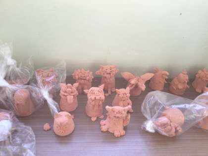 図工室前には5年生作の「シーサー」が見守っていました。かわいらしい表情に和みます。持ち帰ったらご家庭で飾ってください。