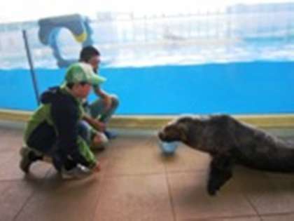 たくさんの観客がいる中、中丸小の友達がアシカとのキャッチボールが