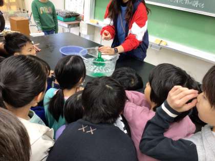 2時間目、理科室で4年生が、温度変化による水の状態変化を観察していました。それぞれのグループで、氷やお湯に試験管を入れ、試験管の水の様子を観察するのですが、大きな変化が見られません。先生が水に色を付けた大きなフラスコを氷やお湯に入れ、再度観察させました。思いの外、熱で体積が大きくなる水の様子に驚いていた子供たち。身近な生活の中で熱による膨張や収縮を想起させます。生活と科学的事象との関連を意図的に学習活動で意識させています。