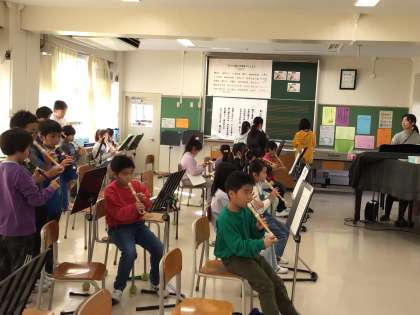 休み時間、音楽室に3年生以上の有志の子供たちが30人集まり、自主練習に励んでいました。12月22日の音楽朝会で「ジングルベル」「赤鼻のトナカイ」の合奏を披露するためです。音楽クラブの子供たち以外にも「やってみたい!!」と参加している子供たちも多くうれしいです。