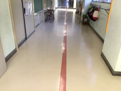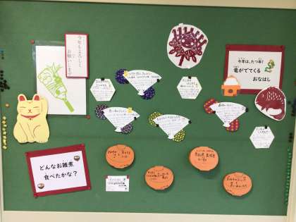 冬休み中に主事さんが廊下にワックスをかけてきれいにしてくれたので、校内が清々しいです。図書室前の掲示がお正月バージョンになっています。