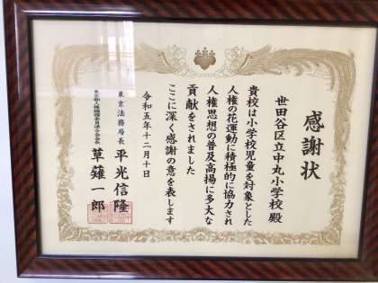 中丸小では人権感覚を大切にした学級づくり、授業づくりが行われています。先生方は、あたたかく思いやりのある言動で指導にあたっています。子供たちは、同じクラスの中だけでなく、違うクラス、違う学年の子供たちに対しても、さりげなく親切な行動をとることができます。中丸の「ふだんの」「あたりまえな」教育活動が、人権普及活動に貢献したと表彰されたので全校朝会で紹介しました。これからも中丸小では、人権教育にていねいに取り組んでいきます。