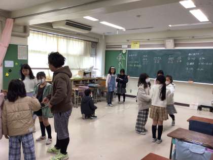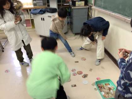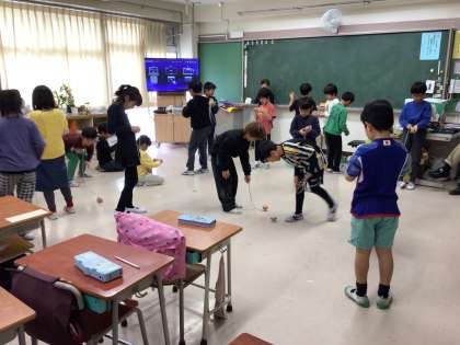 4時間目は2年生全員がグループに分かれ、昔遊びに取り組んでいました。地域の方といっしょに楽しんだ昔遊びを、今度は1年生に教えてあげる「なかよしあそび」にパワーアップするためです。