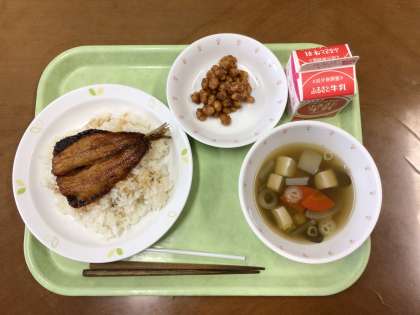 明日の節分にちなみ、今日の給食の献立は、いわしのかば焼き丼と黒糖おまめかりんとうです。1年生教室では、自分の心の中から退治したいオニを描いていました。「おこりんぼうオニ」、「わすれんぼうオニ」など、私も退治したいです。