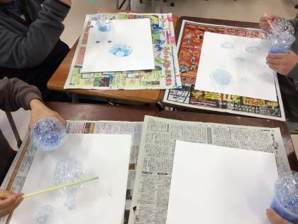 2年生は教室で、泡からイメージし絵を描いていきます。3年生は図工室で釘打ちに挑戦。安全な補助具を用いて釘打ちに取り組んでいました。