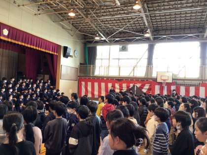 今日の5時間目は、響きの学び舎 駒留中学校3年生の生徒さんをお招きし、中丸小3年生以上の子供たちと合唱交流しました。さすが!「響きの学び舎」だけあって、駒留中の生徒さんも中丸小の子供たちも歌声がすばらしかったです。中学生にしか出せないバスやテノールの重低音の響きに小学生は圧倒されていました。中学生からの合唱、6年生との交流合唱、小学生からのお礼の合唱と5曲が披露され、いつものやわらかい歌声に加え、迫力ある歌声で中丸ホールが包まれました。代表児童からの質問にもていねいに応えていただきました。6年生にとっては4月からの中学生生活への期待が大きくなる時間になりました。