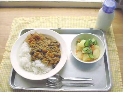 今日の献立は、ドライカレーライス、じゃがいもサラダ、牛乳です。