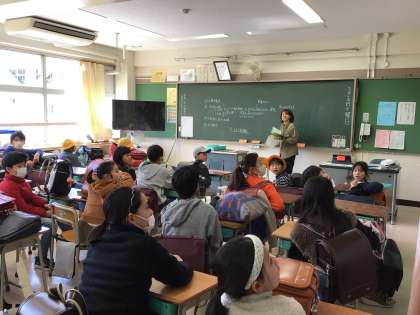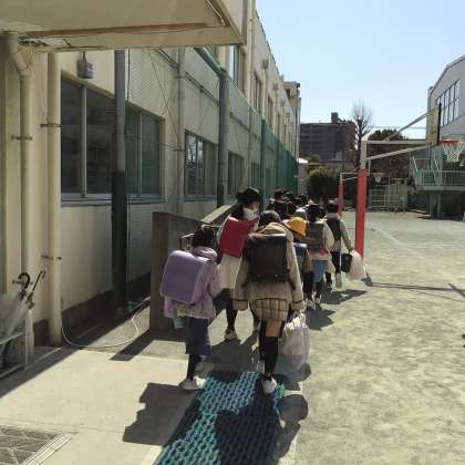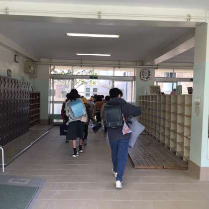 今日は2回目の地区班集会、集団下校です。中丸小では1学期はじめと年度末に地区班での集団下校を行っています。自分たちの日ごろの登下校の様子を振り返り、改善していきます。広がって下校する姿については、「危なかった」経験もあった子供たちが振り返りをしていました。上学年児童が下学年児童をやさしく見守りながら帰っています。