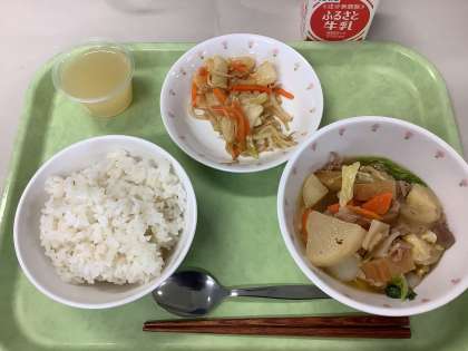 麦ご飯 豚肉と大根のうま煮 野菜のからし醤油かけ りんごゼリー 牛乳