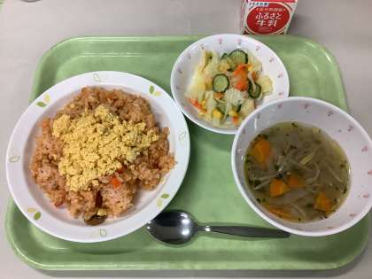 今日の献立 チキンライス ポテト入りフレンチサラダ 野菜スープ 牛乳