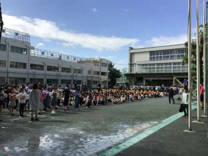今年度1回目の体育朝会を行いました。今後も体育朝会は月に1回行い、安全な体育の授業や体力を高める学習のきっかけにします。また中丸小では、体力向上のため2・3学期には、短なわや長なわにも重点的に取り組みます。