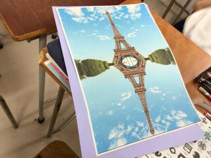 6年生が算数と社会科と図工のクロスカリキュラムの授業をしていました。対称な図形の基本内容を学習した後で、47都道府県章のデザインから線対称や点対称を見つけたり、身の回りや国内外の建物の対称性の美しさを見つけて作品を創ったりしていました。