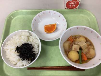 ご飯 しそひじきふりかけ 新じゃがのそぼろ煮 カラマンダリンオレンジ 牛乳