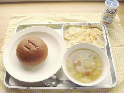 今日の献立は、ココアパン、マカロニグラタン、コンソメスープ、