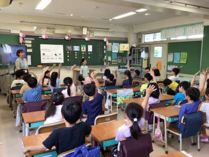 1年生は、お話の聞き方、学習への取り組み方がすばらしかったです。お友達といっしょに小さい「つ」のつく言葉をリズムに乗って表現したりクイズにし合ったりして親しみました。小さい「つ」のつく言葉をたくさん書いて満足気な表情でした。