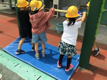 おにごっこの時は鉄棒近くまで行かないよう、コーンバーで区切っています。鉄棒で遊ぶ時は、鉄棒の下にマットを自分たちで敷くなど、自分たちで安全な状況をつくりながら遊んでいます。