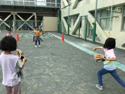 6年生児童が提案してくれた大谷グローブに親しむプロジェクトも先生方と話し合い、場所と期間を設けてローテーションで楽しめるようになりました。早速、今日の割り当てクラスの子どもたちが交代しながらキャッチボールを楽しんでいました。