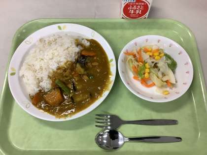 夏野菜のカレーライス コーンサラダ 牛乳