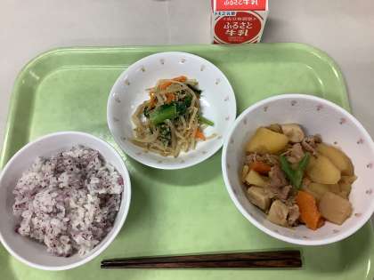 ゆかりご飯 肉じゃがうま煮 ごま和え 牛乳
