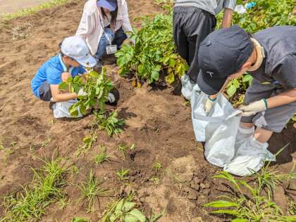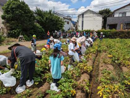 駒沢公園で一休みしたあと、秋山農園に着きました。暑いけどがんばって掘ってます。お手伝いの保護者の方、ありがとうございます。