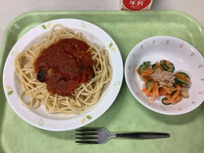 ナスとトマトのスパゲッティ ビーンズサラダ 牛乳