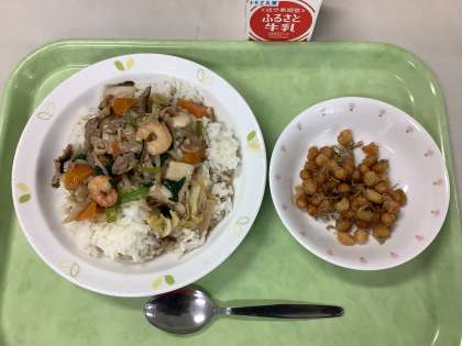 中華丼 大豆とじゃこの甘辛あげ 牛乳