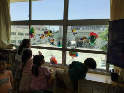3時間目、1年生はカラーセロファンを使って「ひかりのくにのなかま」を作っていました。窓に飾り、光を透けさせたり反射させたりして楽しんでいます。
