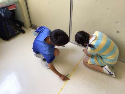 3年生は、巻き尺を使って長い長さを測っていました。教室の中のものの長さは1m定規、巻き尺を使って測りつくしたらしく、廊下の長さを測っています。およその長さを予想し、実際の長さを測ります。学校の外にあるもっと長いものの長さを測るにはどうしたらいいか、考えていきます。