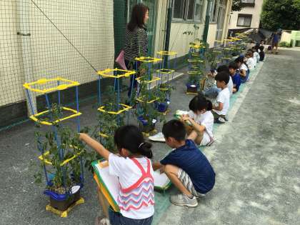 2年生はミニトマトを観察しカードに記録していました。子どもたちの背丈ほどに伸びたミニトマト。なかなか大きい実もなっていて成長の様子をうれしそうに記録していました。