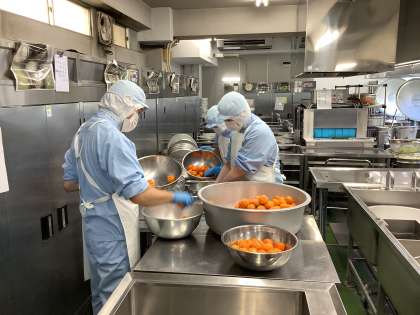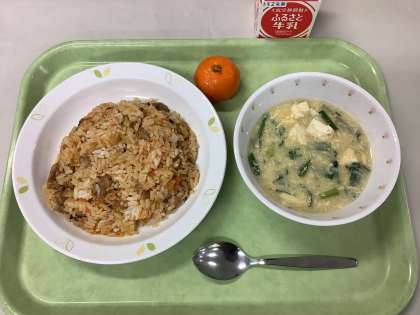 キムチチャーハン にらたまスープ 冷凍みかん 牛乳