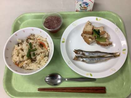 とりめし 焼きししゃも 生揚げの煮びたし あじさいゼリー 牛乳