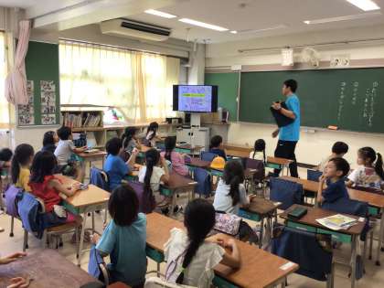 涼しい教室で、1年生は教科日本語「たいしどうばしのこづれぎつね」の民話に親しんでいました。大人の感覚では「太子堂」は区内で近いと思ってしまいますが、子どもたちは「知らない」ので、地図の中から見知っている地名「三軒茶屋」を見つけてからお話に入ります。今、区内で野生のキツネを見ることはないですが、昔は民話に残るくらい、人と動物が近い距離で暮らしていたことを感じてもらえたと思います。