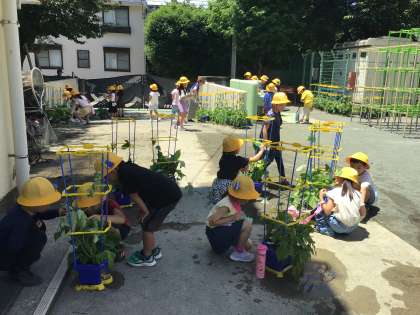別のクラスの1年生がアサガオの水やりの世話をしつつ葉や茎の観察をしていました。夏休みに持ち帰って観察と世話をします。花を使って色水つくりや押し花つくり、茎を使ってリースを作っていきます。種は来年の1年生のためにいくつか取っておきます。