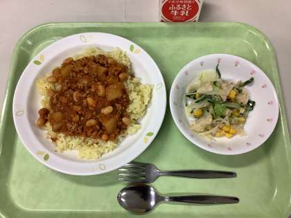 チリビーンズライス 水菜とツナのサラダ 牛乳