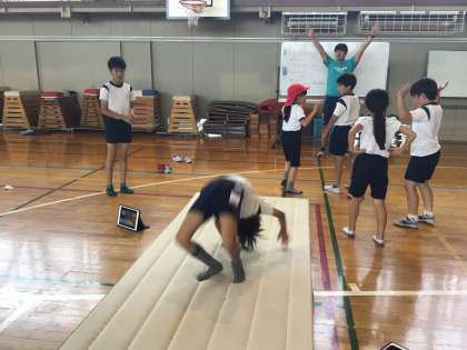 4年生の器械運動の学習ですが、自分の動きを動画で撮り、課題改善に向けて取り組んでいました。