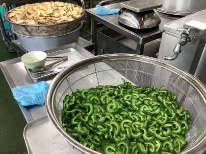 夏が旬のゴーヤは、下茹でして油でパリパリに揚げて野菜チップスにしました。苦味が少なく食べやすいです。
