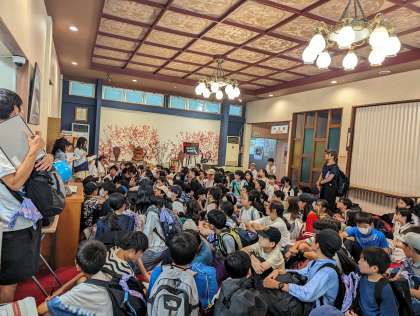 宿舎に着きました。これから避難訓練をしたあと、入浴、夕食、ふくべ細工を行います。お世話になる宿の女将さんと豆女将さんがあたたかく出迎えてくれて子どもたちもうれしそうです。