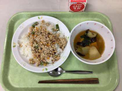ふわふわそぼろ丼 夏野菜のみそ汁 牛乳