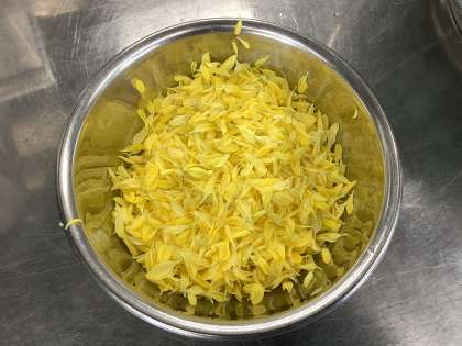 今日の給食は、食用菊の花びらを使った、菊花和えを作りました。