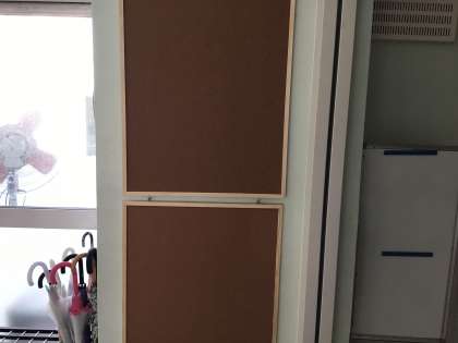 昇降口壁面に主事さんが掲示板を作ってくださいました。保護者の方や地域の方がご来校されたときに一番目に付く場所です。PTAさんからのお知らせを主に掲示します。