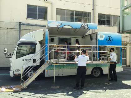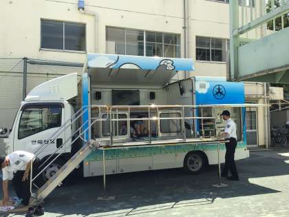 今日は避難訓練のあと、4年生だけ起震車体験を行いました。世田谷区では震度5以上の地震を「強い地震」と想定しています。世田谷区からお借りした起震車では、この想定をはるかに超える震度7のゆれを体験しました。ゆれがくると分かっていても立っていられないほどの大きなゆれです。ゆれが起きても被害を最小で抑えられるよう、学校では施設の強度補強をしています。ものが落ちてこないところを確認し、どんな状況でもまずは頭を守る、身を守ることを訓練しています。