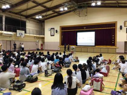 今日の5時間目、6年生は響きの学び舎 駒留中学校で授業体験を行いました。同じ学び舎の旭小・駒繋小の6年生と一緒に受けました。はじめに駒留中学校生徒会役員の生徒さんから中学校での学習、定期考査、駒留中の行事についてお話してもらいました。