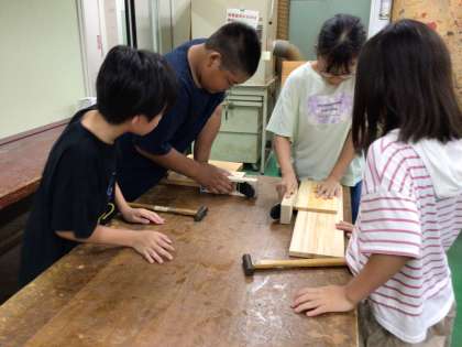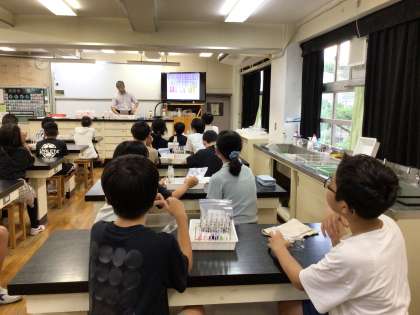 そのあと教科ごとに分かれ、授業を体験しました。技術科室では、小学校では見かけない「かんな」がけを体験しました。注意事項を集中して聞き、かんながけを行うことができました。理科室では中学3年生で学習する酸性・アルカリ性について身近な紫キャベツ液を使って8種類の液体を分類しました。小学校ではリトマス試験紙を使って、酸性・アルカリ性に分けることを学びますが、酸性、アルカリ性の強弱まではリトマス試験紙では分かりません。紫キャベツ液を使って今回、身近にある液体の性質をより詳しく分けることができ、子どもたちはうれしそうでした。半年後の中学校進学に向けて期待がふくらみます。